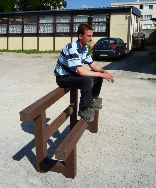 Banc type assis-debout, pour des espaces dédiés aux adolescents. Assis-debout sur la latte du bas ou la latte du haut, ce banc est adapté aux skate-parcs, espaces multi-sports, lycées et collèges, …