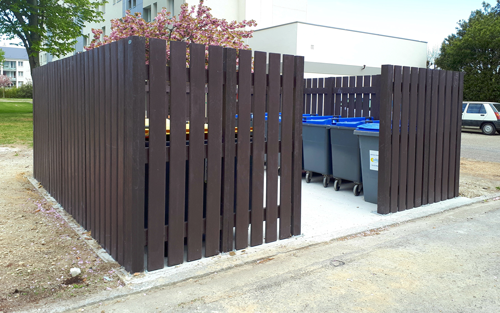 Habillez vos points d’apport volontaire et bacs roulants avec une solution écologique et durable. Les caches-conteneurs CLAIREVOIE sont composés de lattes verticales à bords arrondis montées sur des poteaux, l’ensemble 100% plastique recyclé !