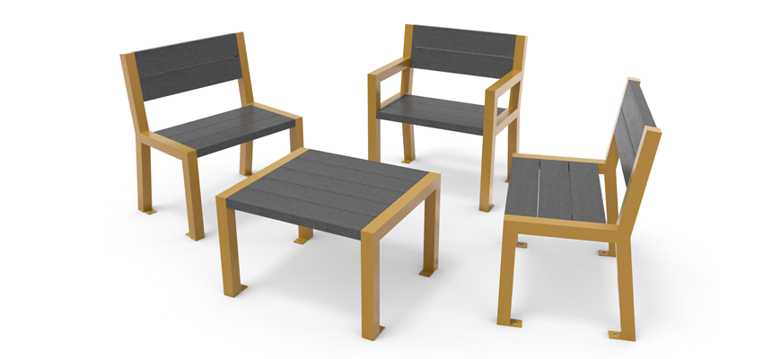 Une gamme moderne et urbaine en plastique recyclé et piétements en métal. Du mobilier idéal pour les parcs comme en ville, pour créer des espaces de repos et de rencontre.